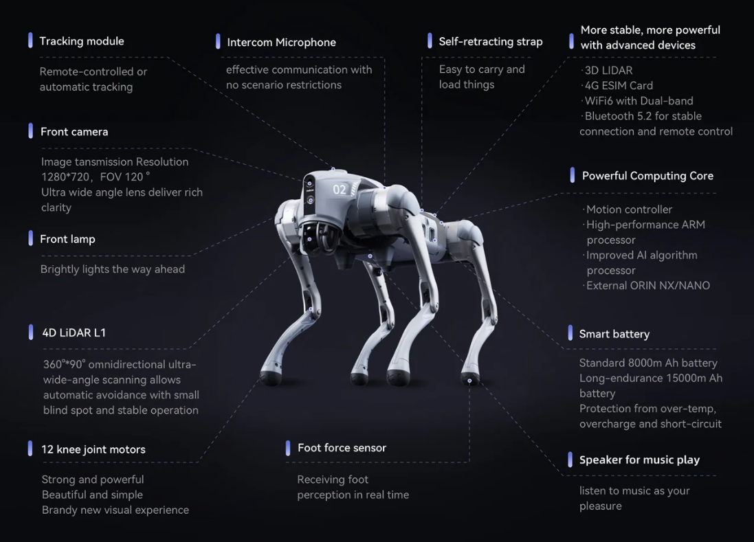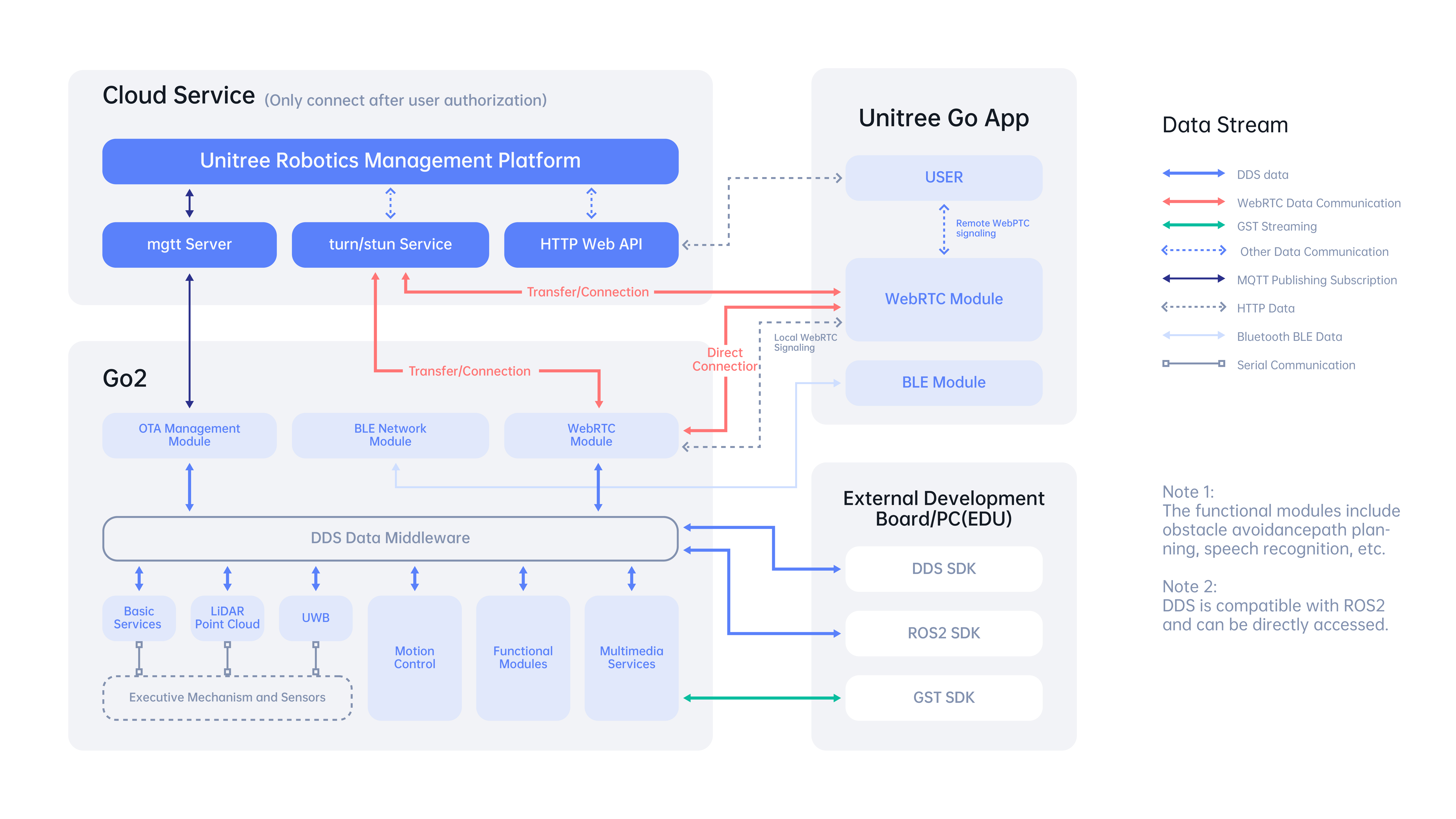 The Wifi/WebRTC module connects the GO2 with Unitree GO App as well as the Unitree Cloud service to use services such as Benben dog (GPT based Assistant mode) and system upgrades.