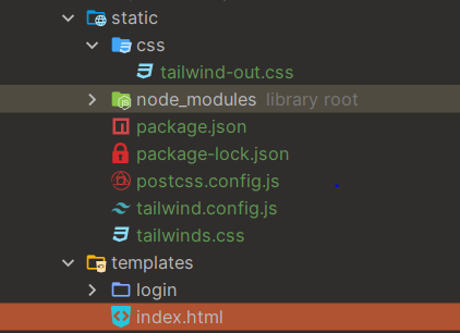 tailwind CLI 빌드를 진행합니다. -i 뒤에 directive css 파일(input)을 지정하고, '-o' 뒤에 output css 파일을 지정해줍니다. 저는 output 파일은 static아래에 css 폴더를 만들어 그 안에 tailwind-out.css 로 만들어 보겠습니다. css/tailwind-out.css
