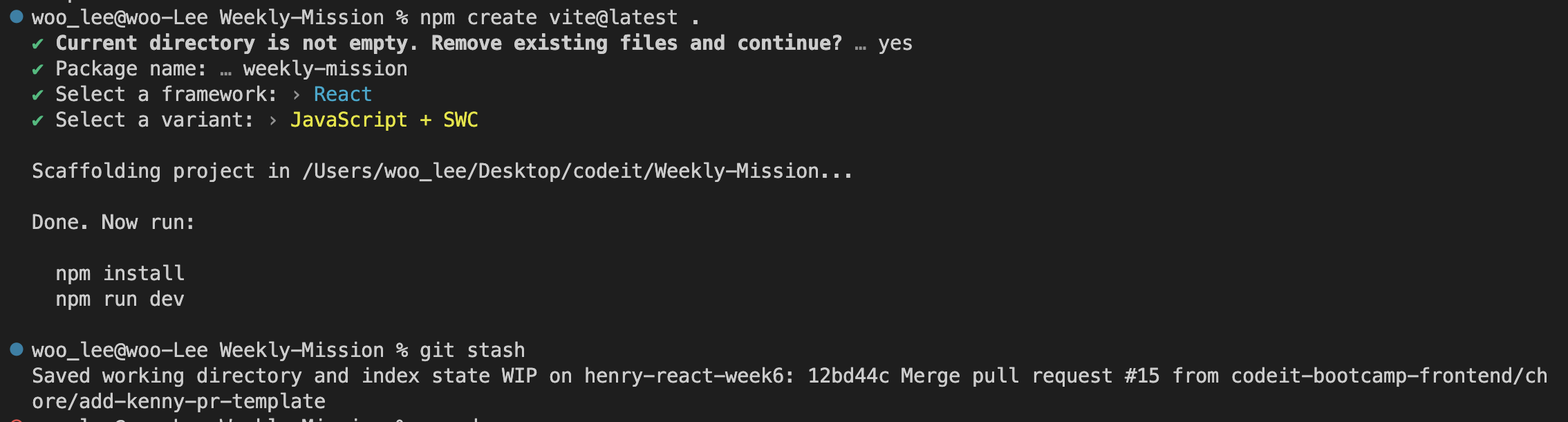 기존 위클리 미션 폴더에서 .github과 README.md 파일 때문에 제거한 뒤 git stash로 복구했다.