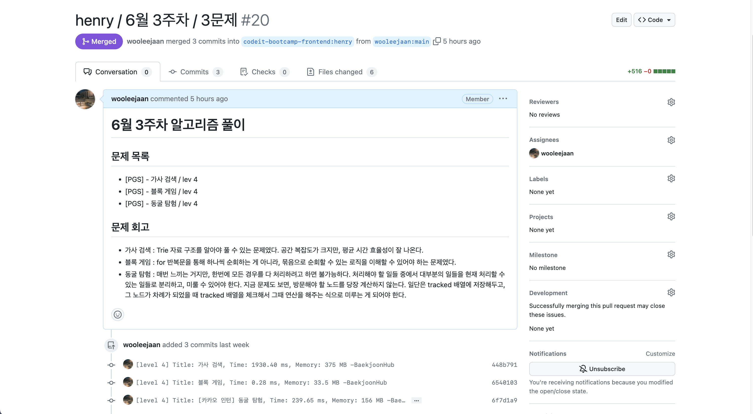 조금씩 알고리즘 문제 풀이에 대한 감을 잡아가고 있다고는 생각한다. 하지만 많이 부족하다. 최근에 프론트엔드 개발자면 알고리즘보다는 과제 테스트를 먼저 준비하는 게 좋다는 이야기를 많이 듣고 있다. 그래서 알고리즘 공부에 대한 회의감을 많이 느끼고는 있으나, 개인적으로 그냥 알고리즘 공부가 재밌어서 공부 시간을 줄일 생각은 아직 없다.