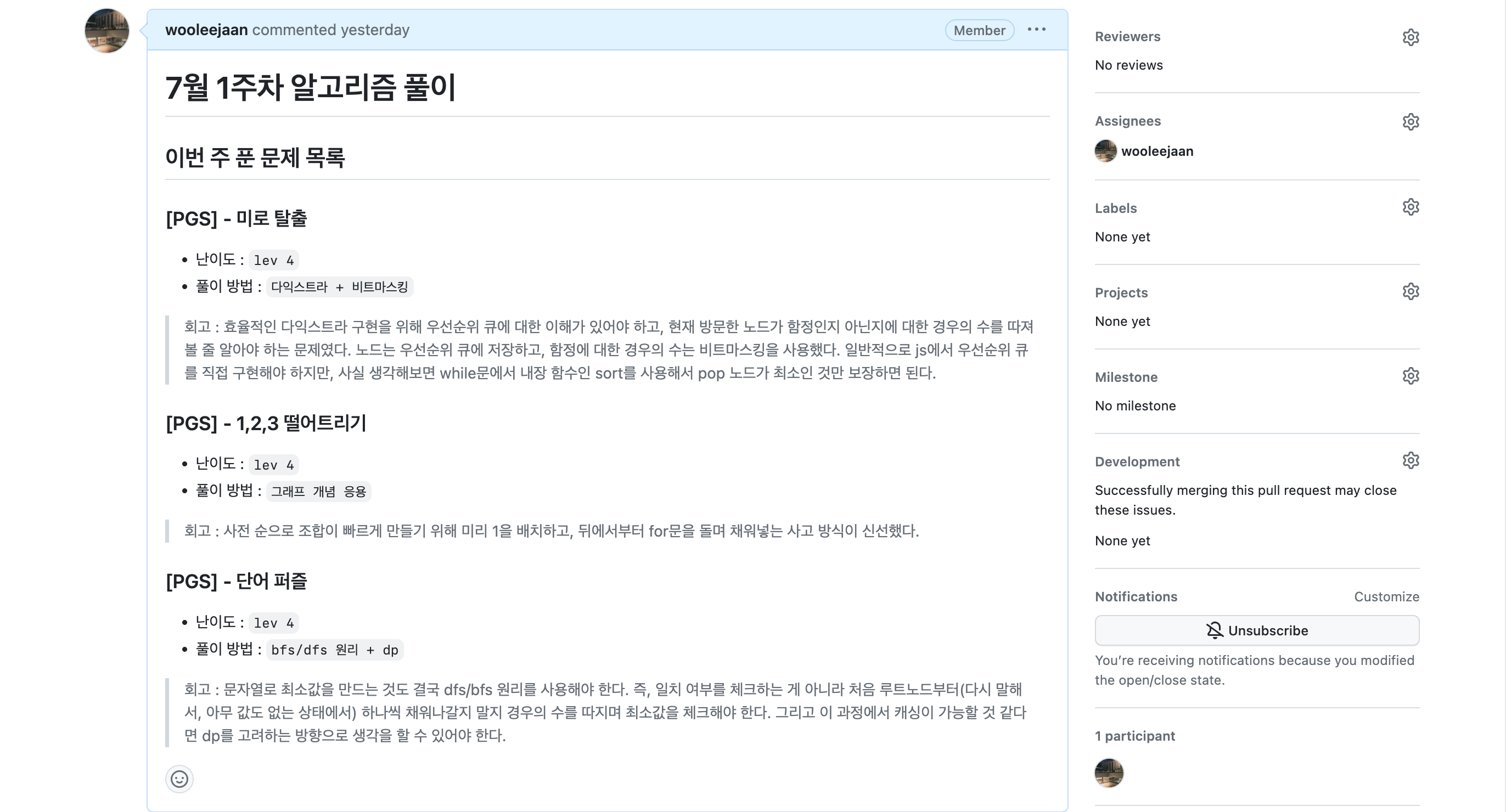 그래프 문제가 조금씩 익숙해졌고, 문자열에서도 dfs/bfs적으로 사고하는 방법을 이해했다. 조금씩 조금씩 알고리즘 실력이 성장하고 있다고는 느낀다. 다만 최근에 어려운 문제만 접하다 보니, 오히려 난이도가 낮은 문제에서 허덕일 수 있다는 불안감이 들었다.