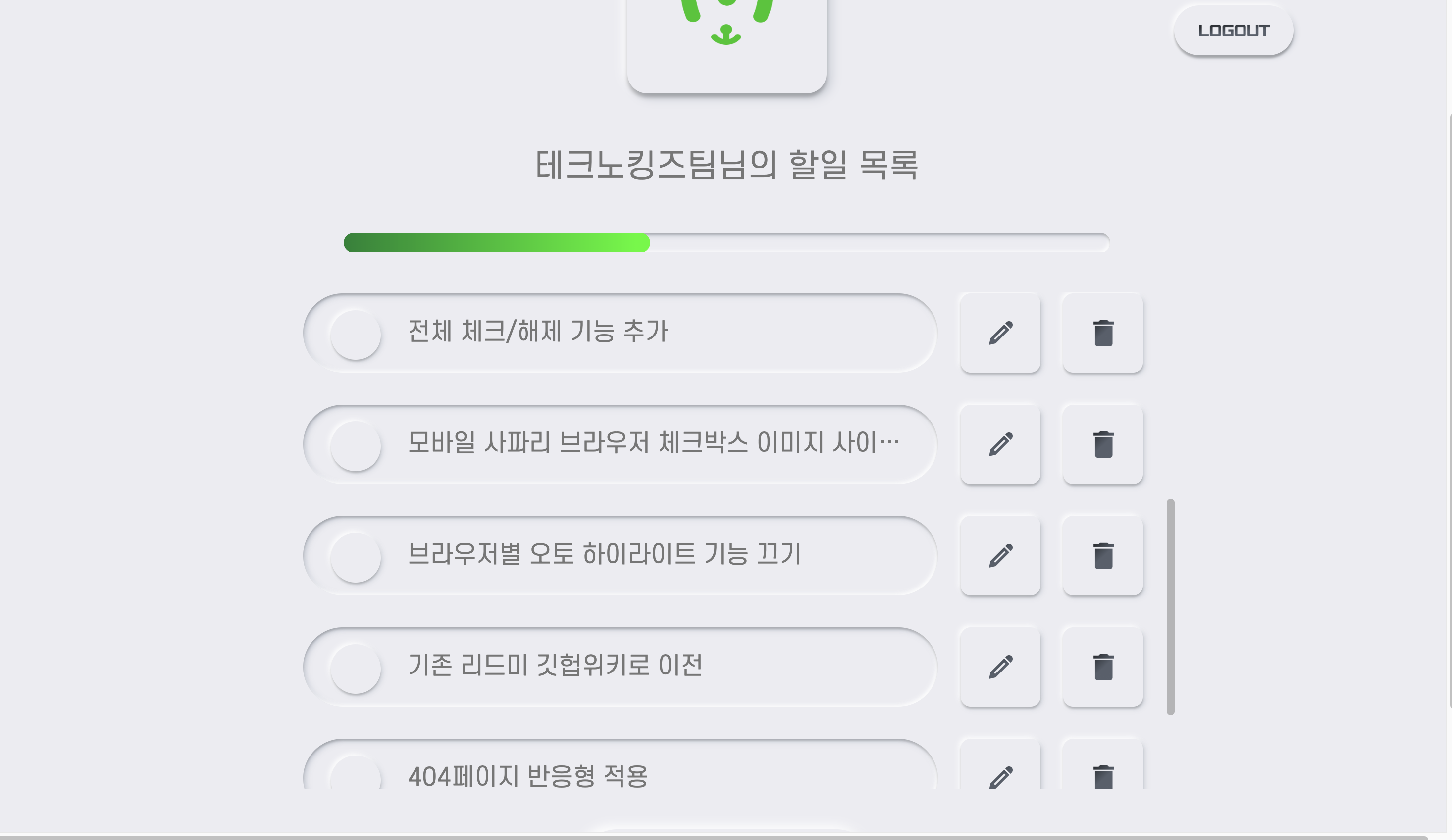 이번 주에 만든 투두리스트에 기능을 더 추가하고, 리팩토링을 하며 계속 확장해나가고 싶다. 배포까지 했으니, 계속해서 피드백을 반영하고 수정해나가면 좋은 경험이 되지 않을까.