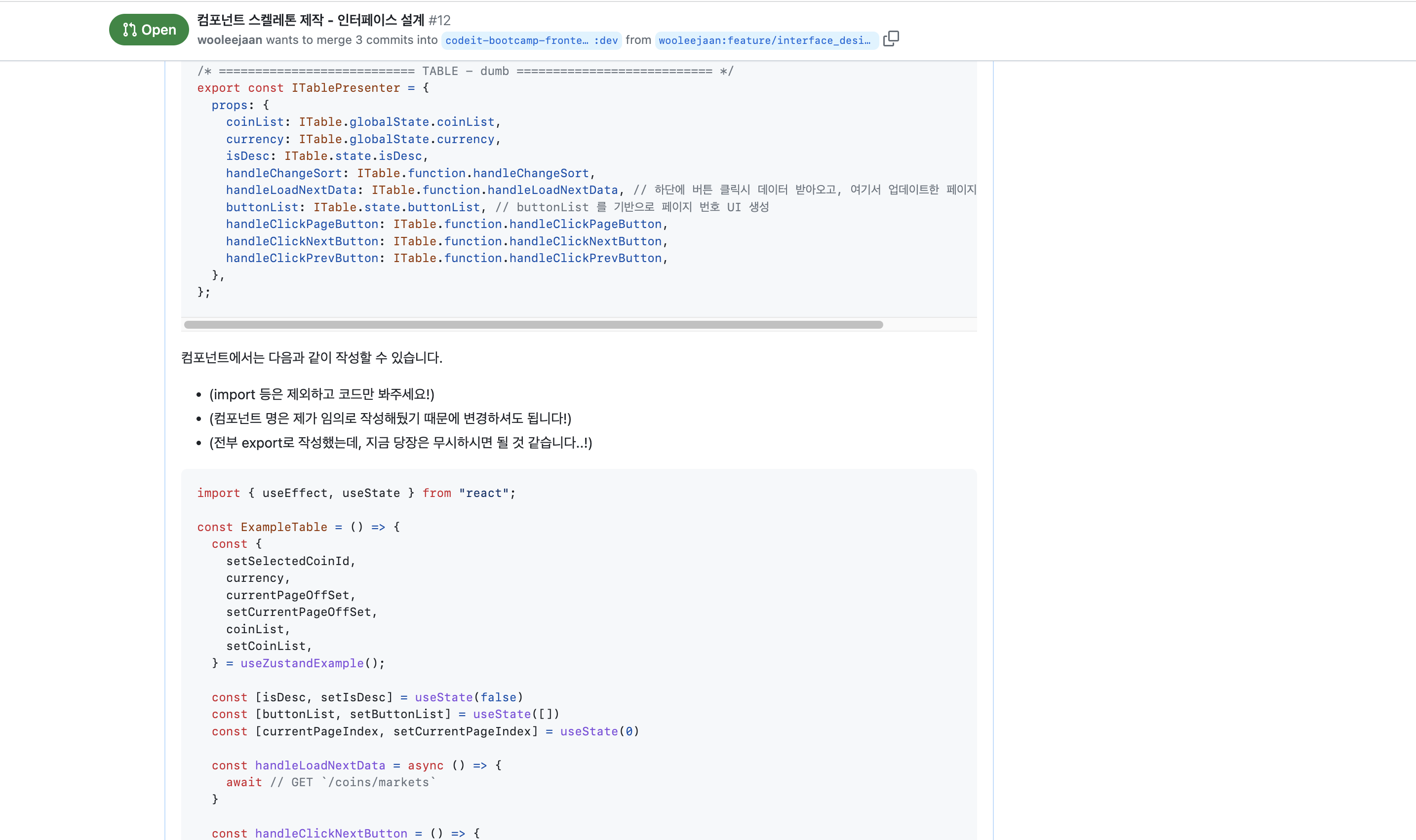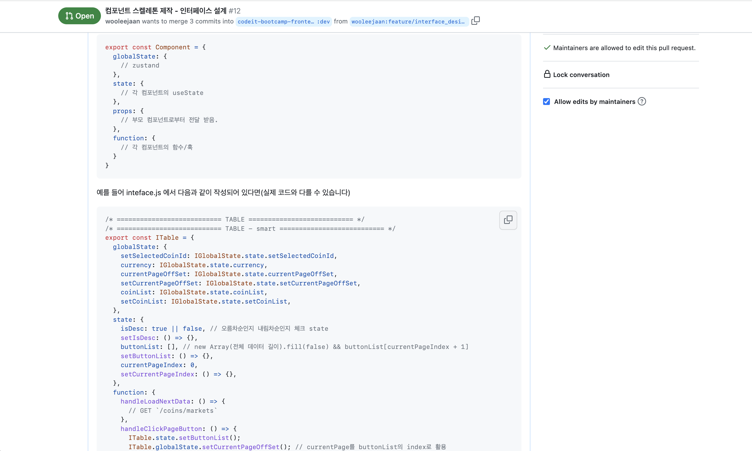 사실 매번 즉흥으로 코드를 작성하고 유지보수를 하는 방향으로만 코드를 작성해봤기에 인터페이스 설계 경험은 새로웠다. 이게 인터페이스 설계라고 하기도 뭐하지만, 최대한 하나의 컴포넌트에서 어떤 props를 받고 어떤 state를 설정하고 어떤 함수를 작성하고, 전역으로 관리할 상태 중 해당 컴포넌트가 어떤 상태를 주입받을 지를 고려하면서 작성했다.