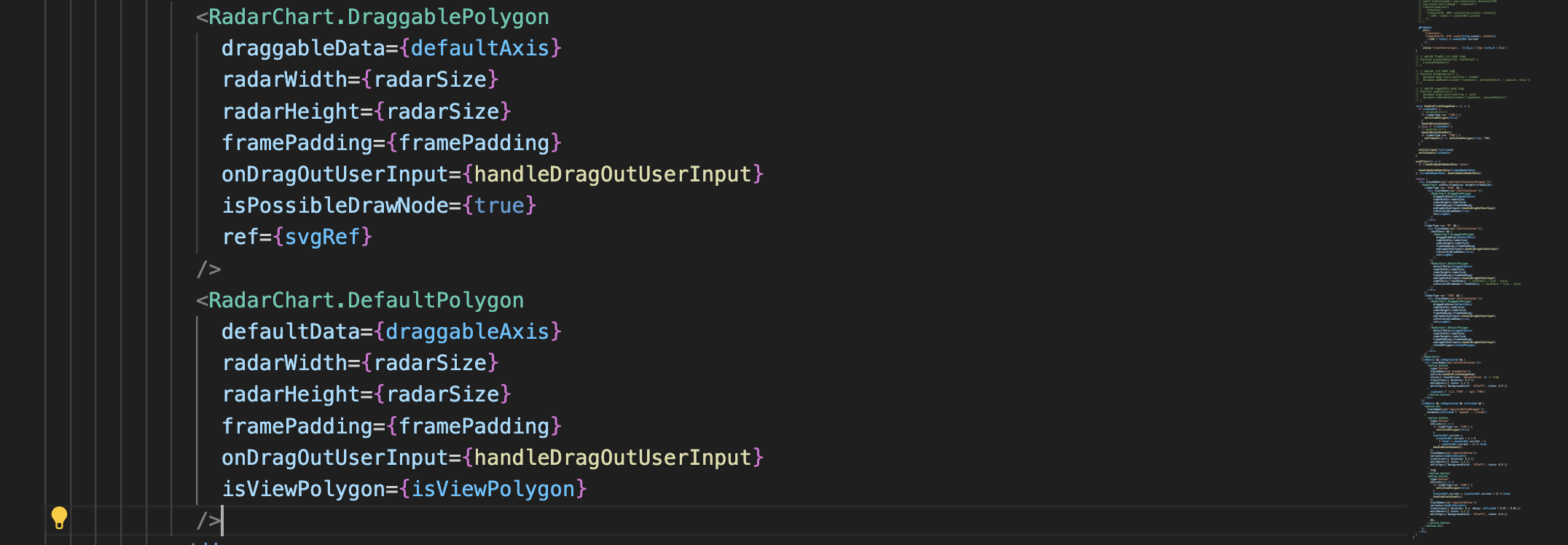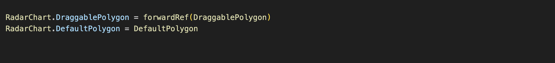 내가 맡은 부분인 RadarChart에 적용해봤는데, 원래라면 아래에서 .DefaultPolygon, .DraggablePolygon 컴포넌트가 받을 prop을 Chart 컴포넌트가 전부 주입받는 코드가 되었을텐데, dot으로 연결함으로써 prop을 나눠 가지게 만들었다. 의존성을 역전했다.