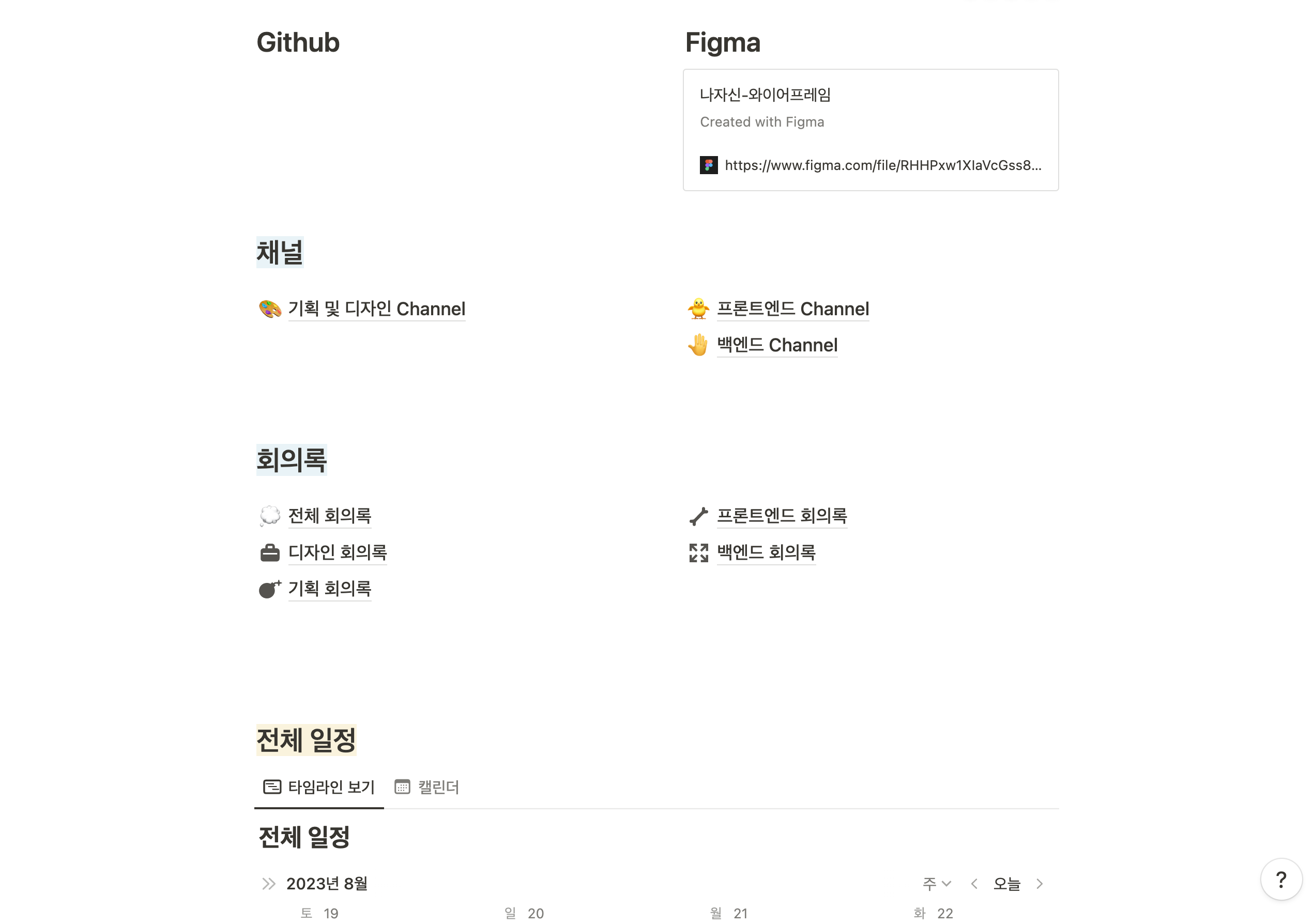 백엔드, 프론트, 기획의 경우 노션에 채널 페이지를 생성해 회의록을 포함한 다양한 문서를 관리했고 디자이너분과는 피그마로 소통했다.