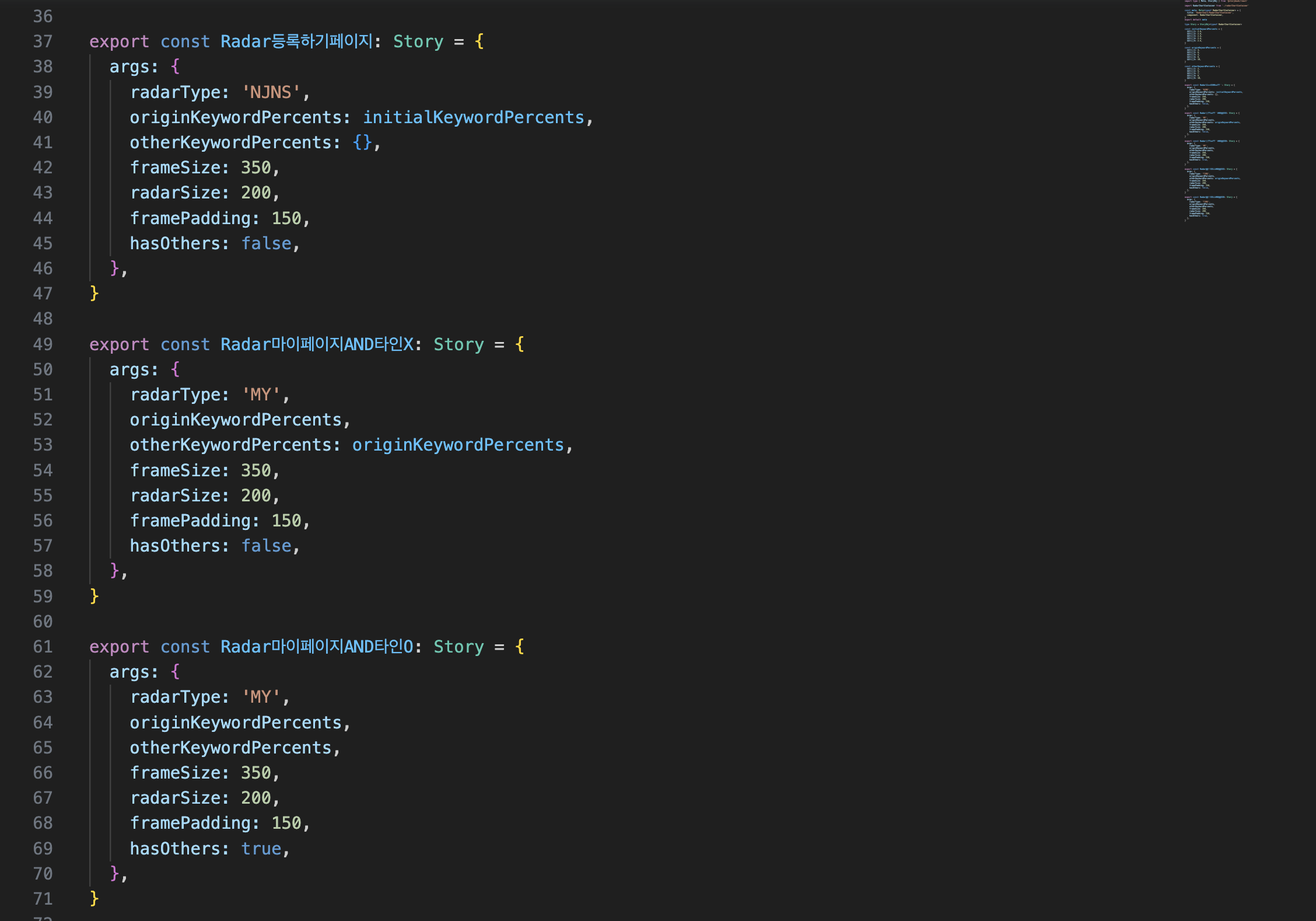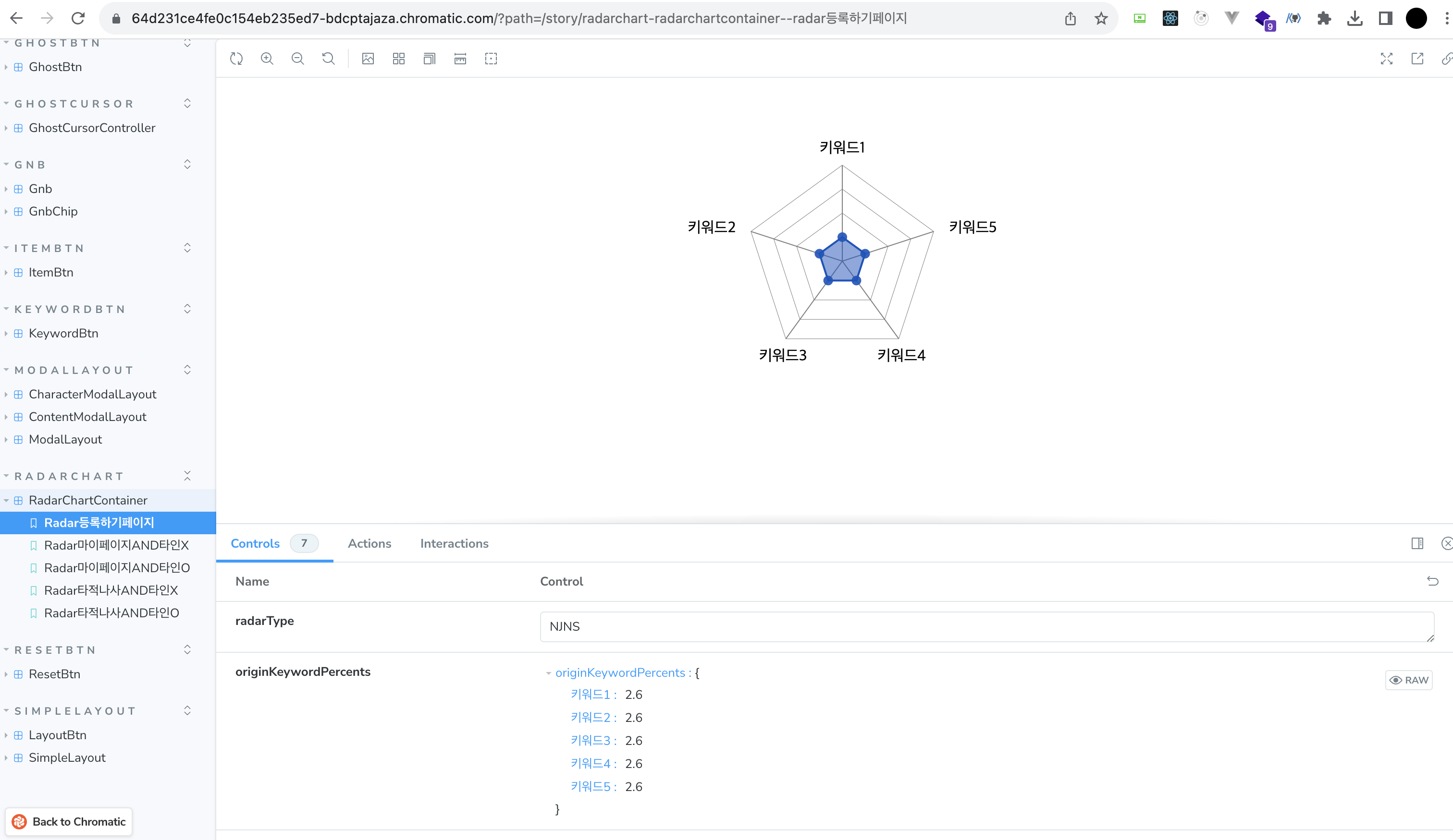 그리고 또 Radar Chart를 만들면서 편리했다. Radar Chart를 거의 모든 페이지에서 사용해야 했다. 그러다 보니 각 페이지마다 주입해줘야 하는 prop이 달랐는데, 스토리북을 사용하지 않았다면 비효율적으로 노션에 정리를 하거나 회의때 말해줘야 했을 것이다.
