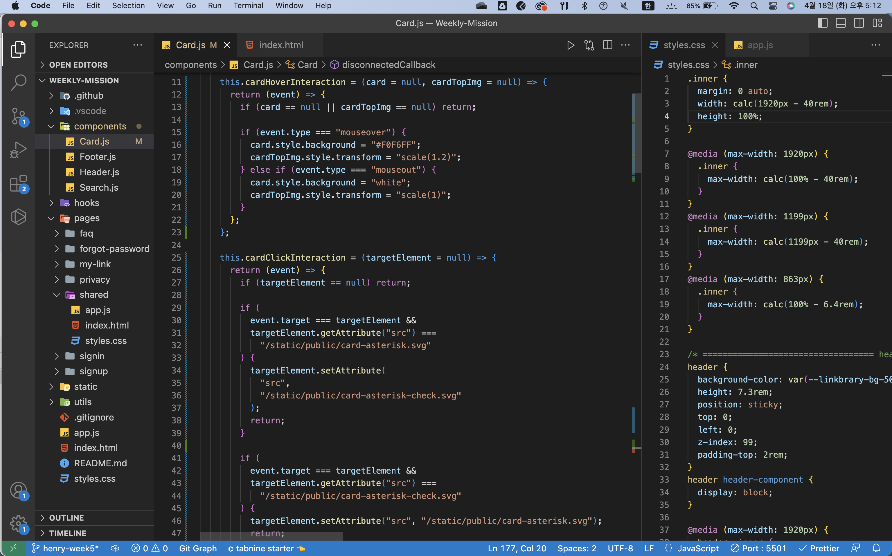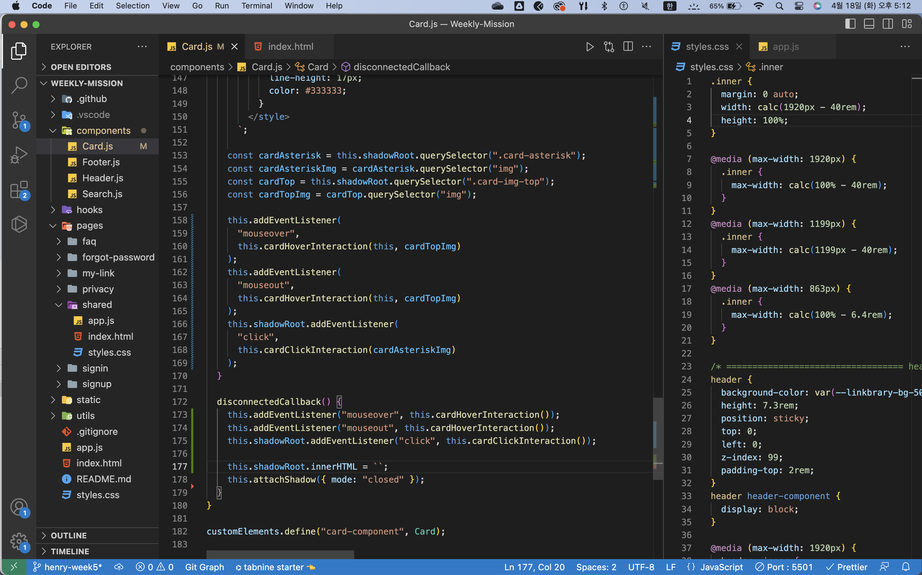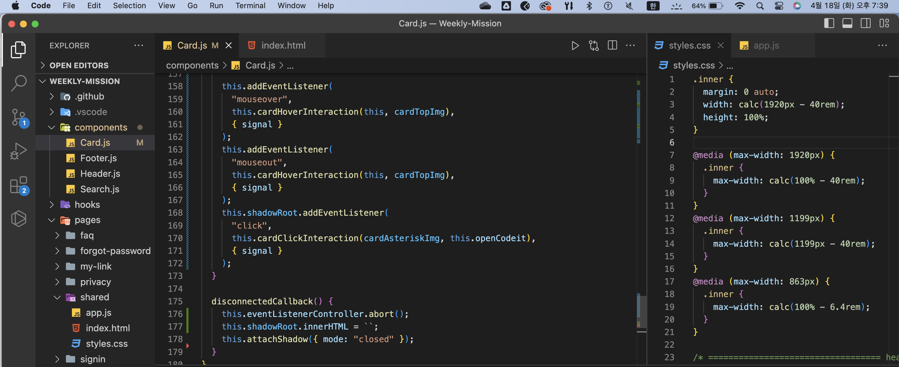 disconnectedCallback()함수에서는 이벤트 핸들러를 삭제하기. 사용하지 않으면 GC가 안 돌아서 허덕일 수 있다.inner클래스를 부모 요소에 삽입하고 의미 없는 div.inner 요소는 남발하지 말고 삭제하기- 카드 컴포넌트 배치할 때