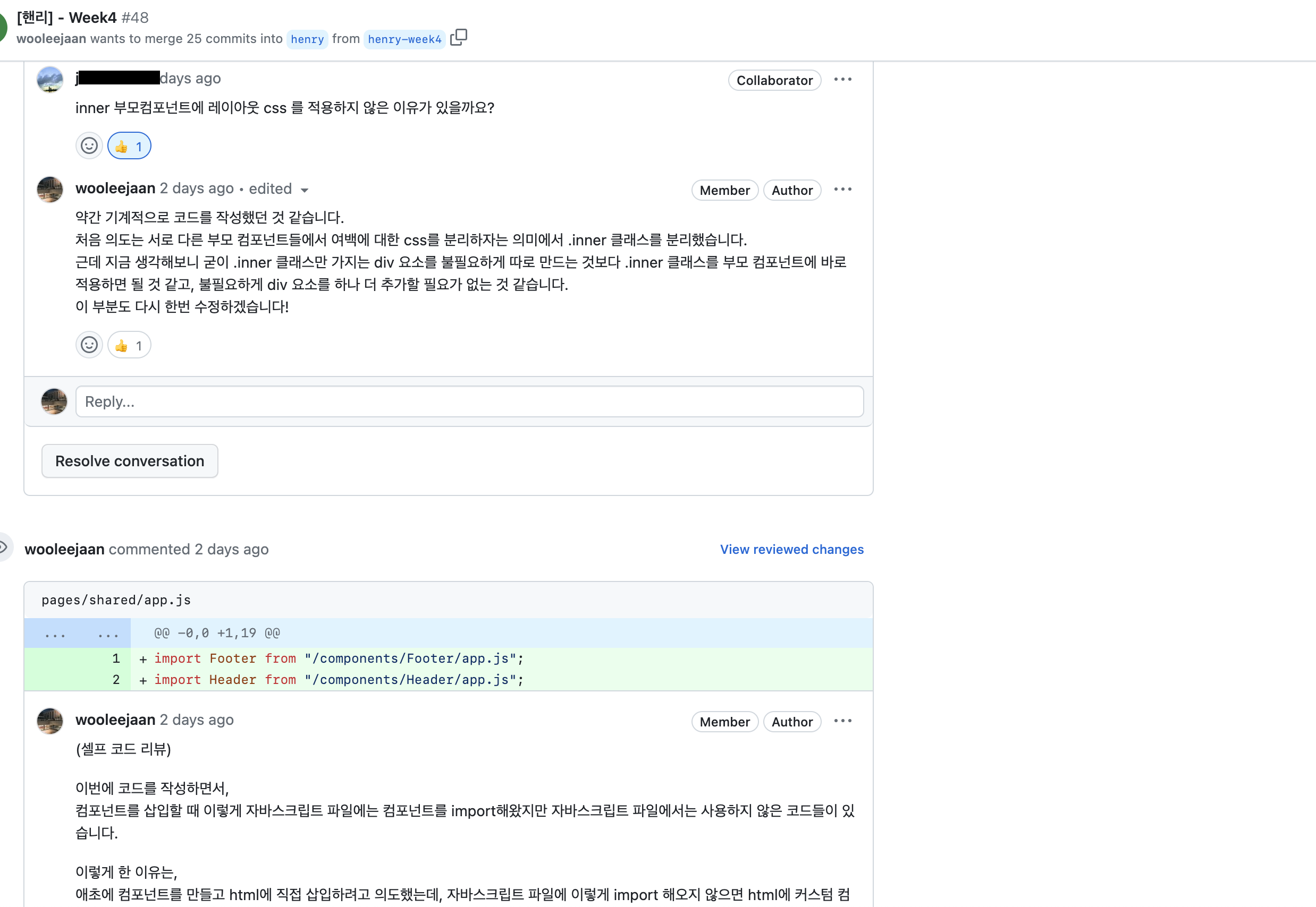 이번엔 셀프 코드 리뷰도 저번 주보다 더 적극적으로 진행했다.