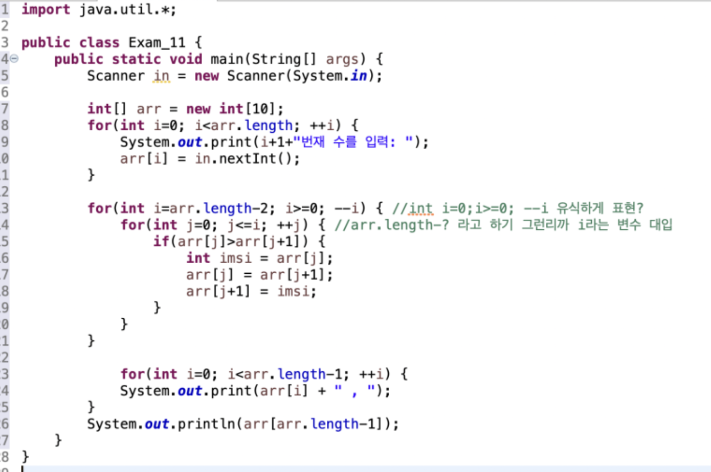 10개의 수를 입력 받아 작은수에서 큰수(오름차순)로 정렬해보자.