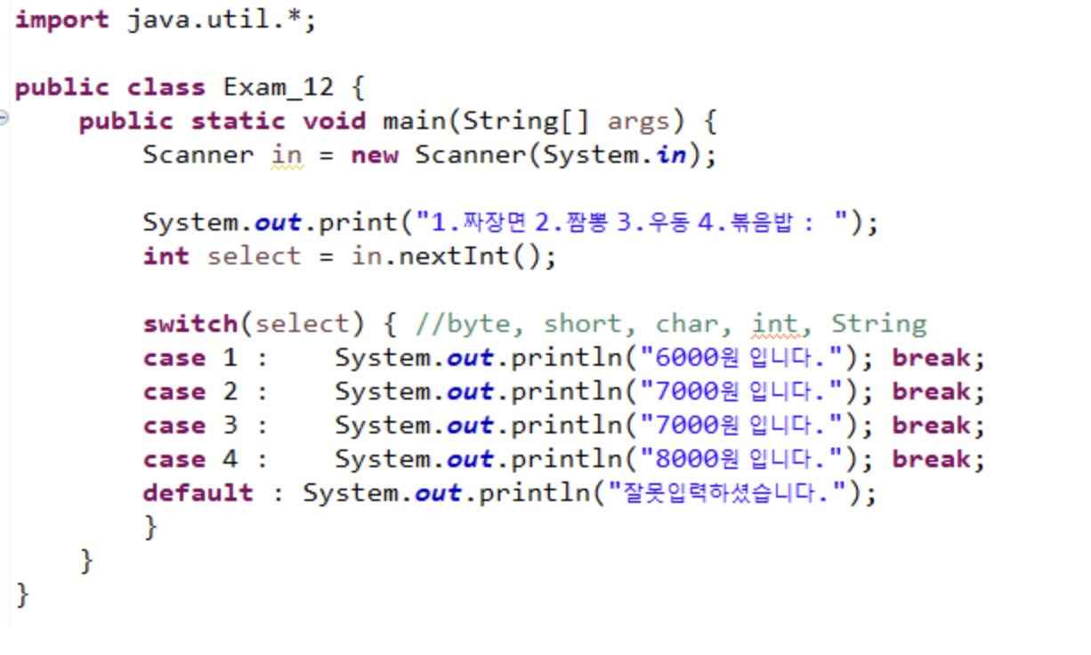 : 비교값 / 상수와 문자열만 가능 순차적 진행이 되지 않도록 break;사용 /