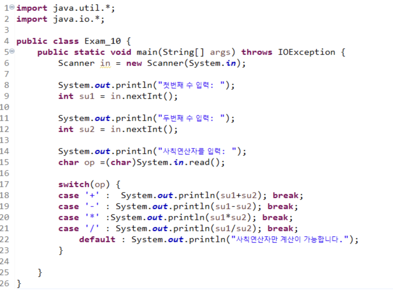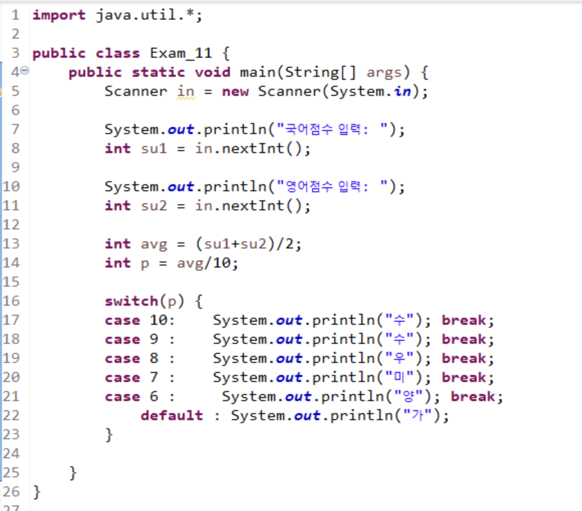 : 어느것도 맞지 않으면 default 실행 / 디폴 트 는 마지막 값으로 break생략 가능