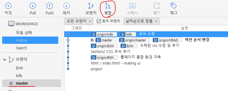 병합할 커밋을 선택 한 후 '확인'을 누르게 되면 마스터 브랜치(로컬)**** 에 병합이 된다.