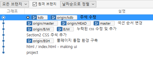 위에서 즉시 푸시를 하였기때문에 로컬 저장소(kdb)원격 저장소(origin/kdb)의 상태가 모두 갱신된 모습이다.