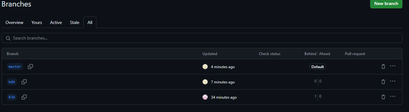 현재 우리 팀플의 원격 저장소의 브랜치들이다.