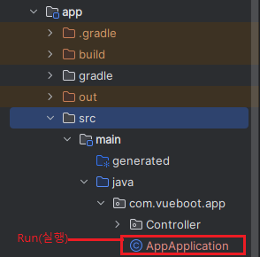 실행 파일 위치 (app>src>main>java>com.vueboot.app)