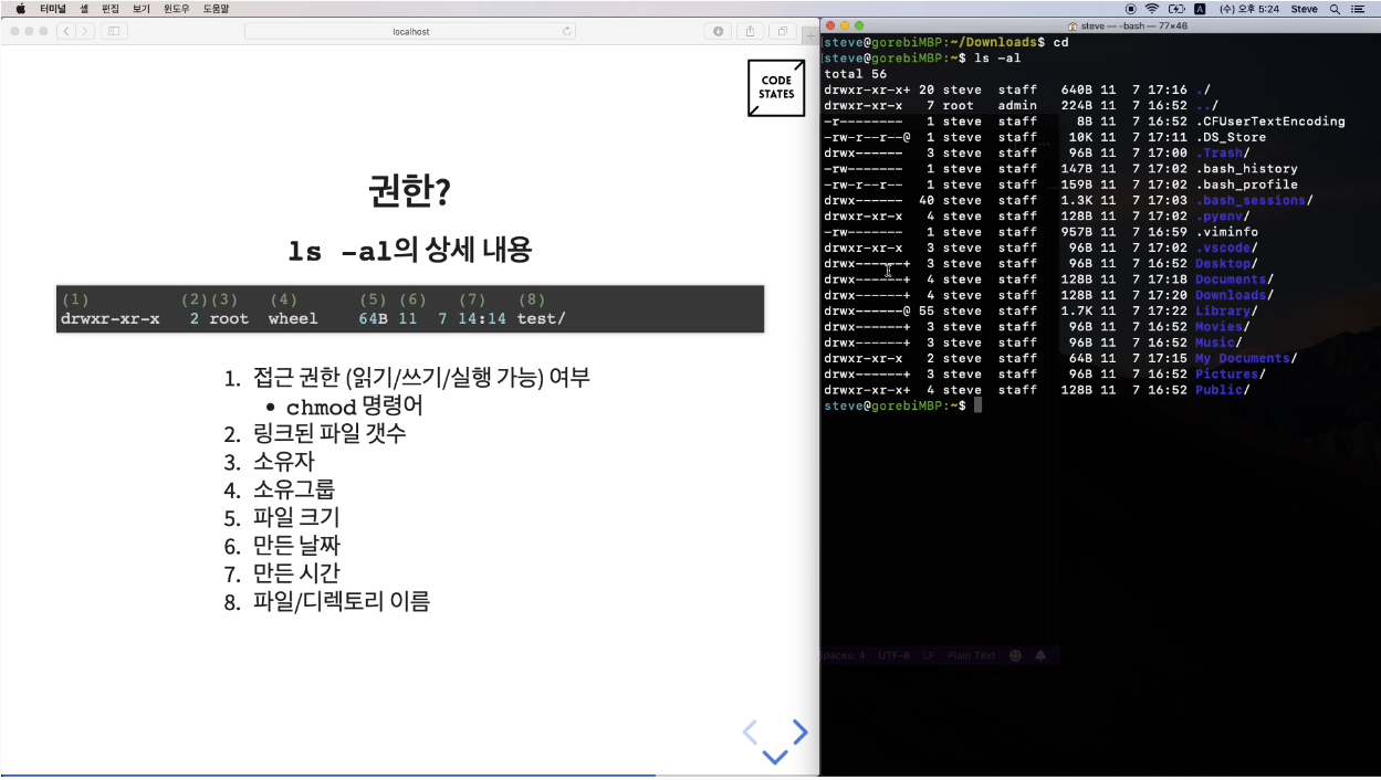 ls -al 의 상세 내용 (ls 뒤에 -al을 덧붙이면 평상시에 안 보이던 파일들까지 상세하게 보여 준다 : list all)