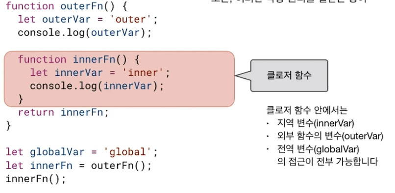 return innerFn; // 이걸 리턴하라고 했으니 리턴되기는 하되, 먼가 실행되지 않은 함수 자체가 리턴된다. 윗 행의 innerFn 함수가 실행된 것으로 착각하지 말것. 함수는 누가 불러줘야 실행 되는데, 아직 불러준 명령이 없으니 그냥 함수만 리턴 되는 것.(함수도 리턴 될 수 있다는 예시임)