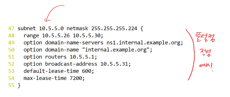 # dhcp 데몬의 설정파일. (위 예시와 같이 구성한다.)