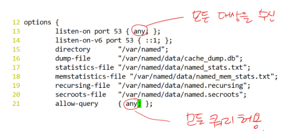 1. /etc/named.conf 수정을 통해 기능적인(수신포트, 허용할 대상) 설정.