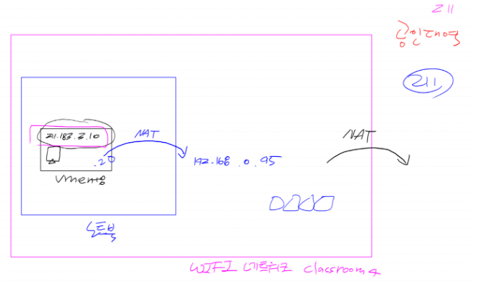 - 추가적으로 vmnet8을 벗어나 노트북밖으로 나갈때 NAT가 되고, 또한 노트북이 속한 WIFI 네트워크에서 공인대역으로 나갈때도 NAT가 되므로 실제로 존재하는 공인아이피와 충돌이 생길일은 없다.