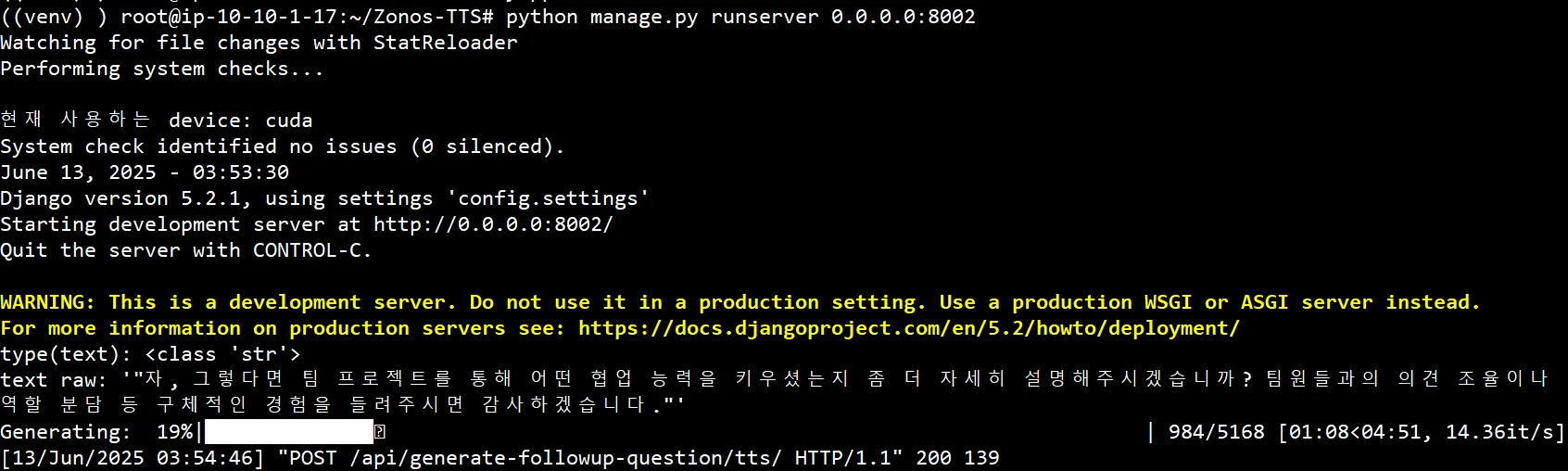 현재 상태: GPU 인스턴스에서 Zonos TTS가 구동되고, Django API로 질문 음성 생성 → S3 업로드가 자동화됨. V2 기준으로 지연/안정성이 개선됨.