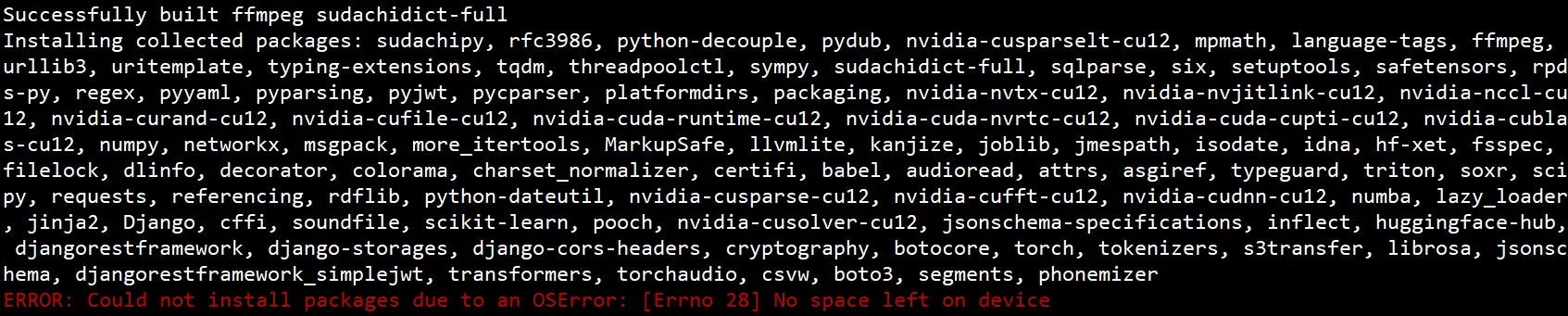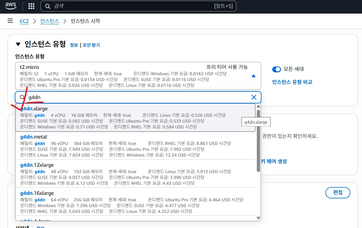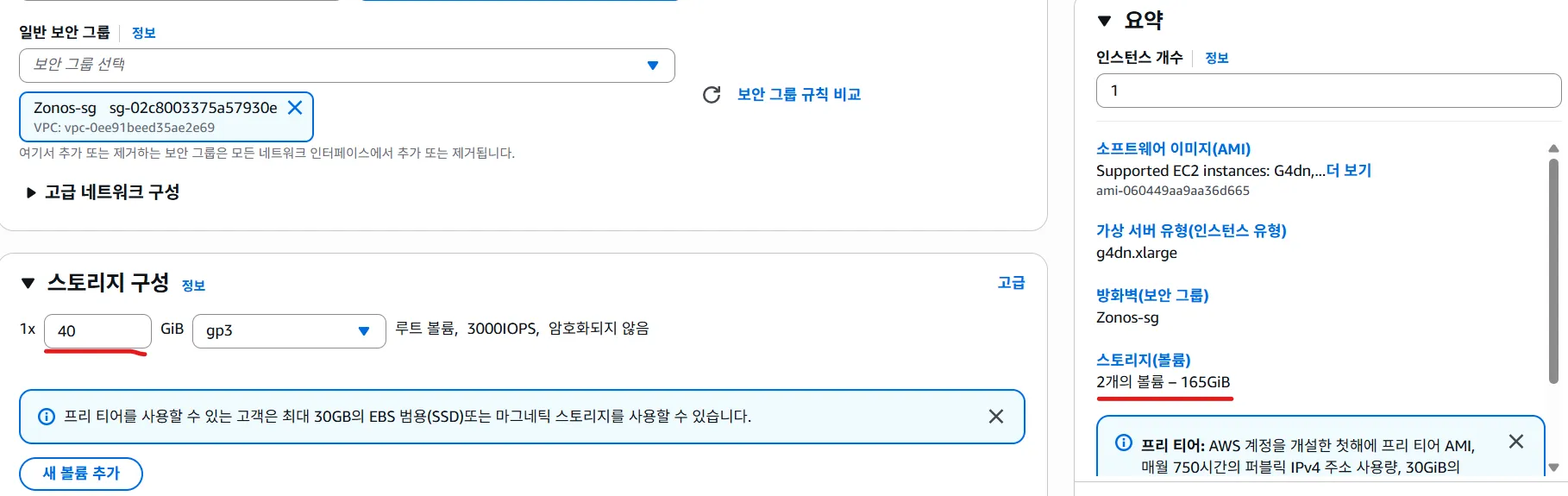 EBS 기본 용량(예: 165GiB)으로 진행했다가 패키지/모델 다운로드 중 용량 부족으로 실패 → 300GiB로 재생성하여 해결.
