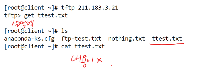[root@ftp ~]# echo 'tftp test file' > /var/lib/tftpboot/ttest.txt