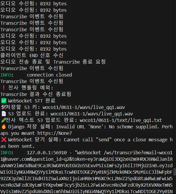 - 프론트(녹음) → 웹소켓을 통해 실시간 트랜스 크라이브 API 호출→ s3에 업로드