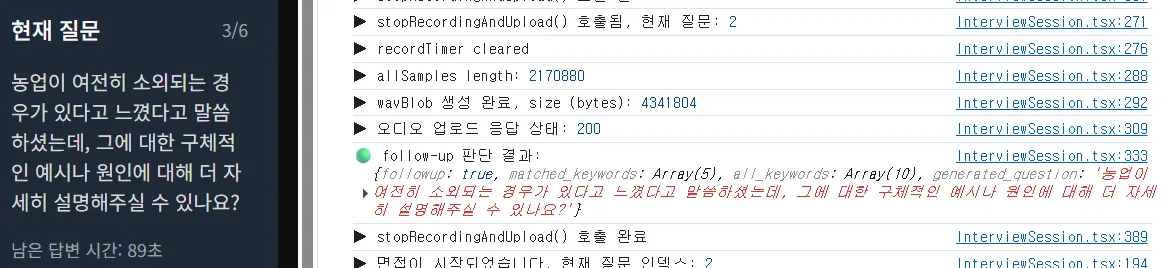 첫번째 질문이 사용자에게 제공이되고, 다음 질문이 자소서 기반의 메인 질문이 될지, 사용자 말한 답변에 대한 꼬리질문이 될지를 판단하는 분기 로직 설계를 해야한다. 판단 기준을 고려하고, 가능한 범위에서 합당한 방법을 찾아야한다.