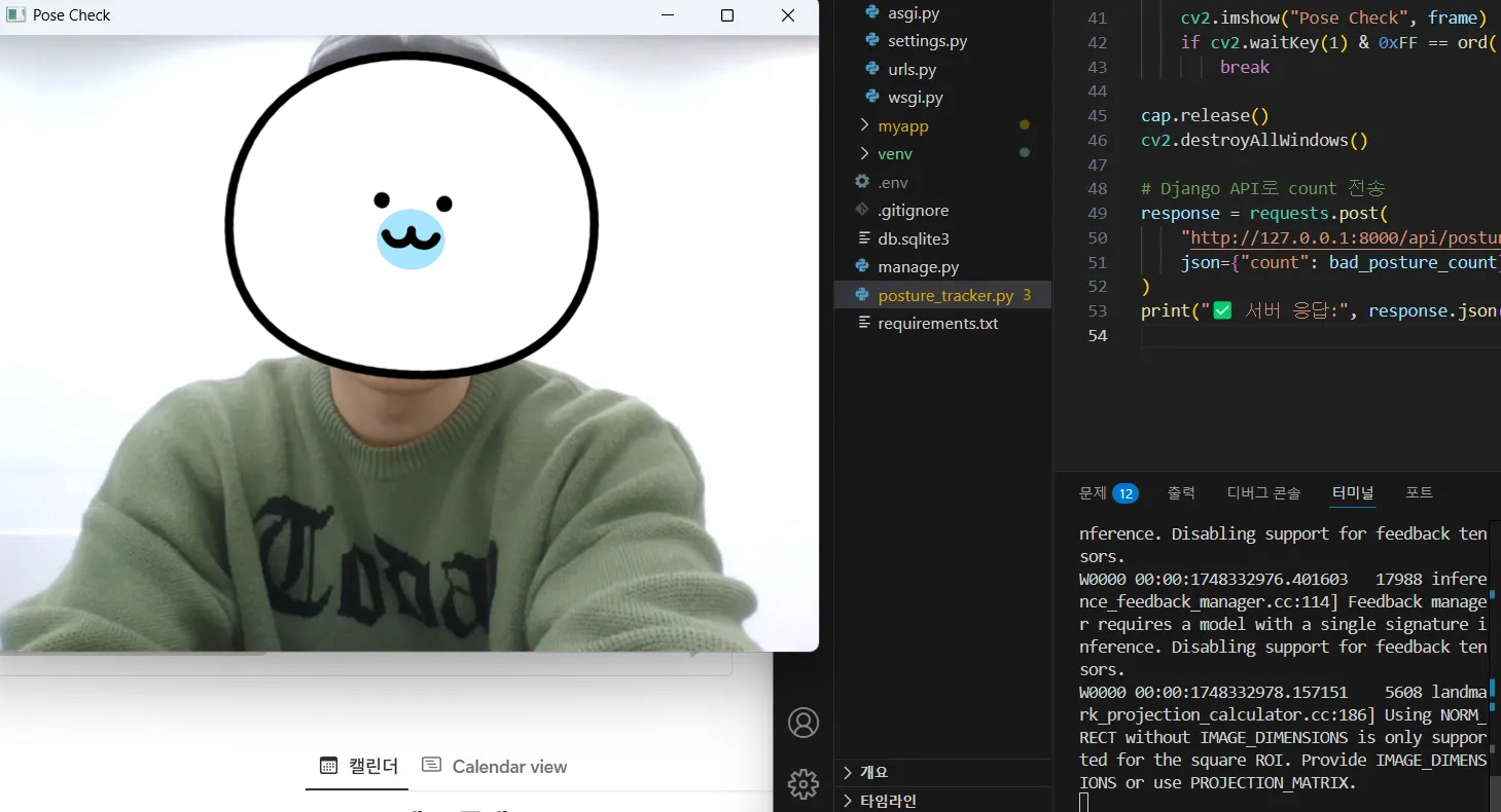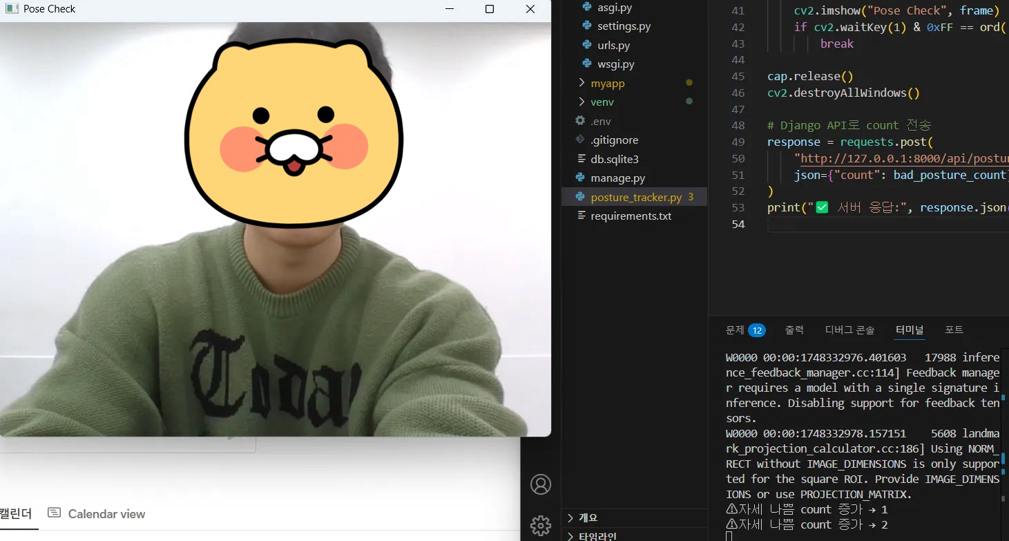| requests | Django 서버로 count를 POST 방식 전송 | 로컬에서 분석한 결과를 서버(DB)에 기록하기 위해 HTTP 통신이 필요했습니다. requests 라이브러리는 간단한 REST API 연동을 지원하여, 자세가 기울어진 횟수를 Django 서버에 POST로 전송하는 데 사용했습니다. |