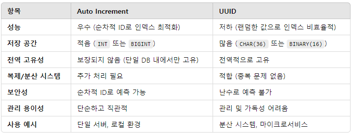 - 복제 및 분산 환경에서 비효율적: 마이크로서비스나 샤딩(데이터 분할) 구조에서 서로 다른 서버 간의 데이터가 병합될 경우, PK의 고유성을 유지하기가 어렵습니다. 이를 해결하려면 복잡한 PK 재구성 또는 ID 할당 메커니즘이 필요합니다.