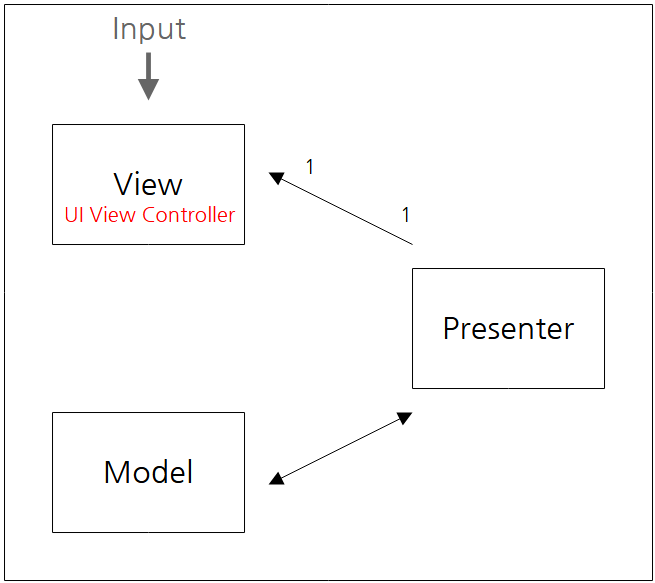 MVC와의 차이점은 Presenter가 MVC의 Controller에서 화면만 떨어져 나간 중간관리자라는 점이다. Presenter는 View는가 어떤 요소를 보여줘야 할 지 결정만 해주고 인풋 아웃풋에 대한 모든 처리를 지니고 있지만 화면과는 상관이 없다. 따라서 View는와 Presenter가는 1:1관계로 의존성이 강하게 연결되어있다.