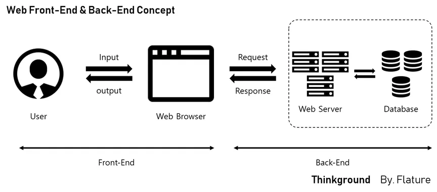 사용자가 웹브라우저를 통해 서버 쪽에 요청을 보내면 이것을 처리하는 영역이 backend이고, backend에서 요청에 따른 응답을 보내주면 이것을 바탕으로 클라이언트의 웹브라우저에 보여질 부분을 처리하는 것이 frontend이다.