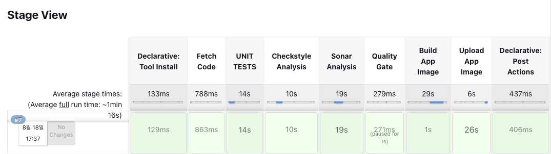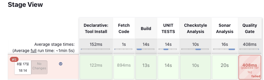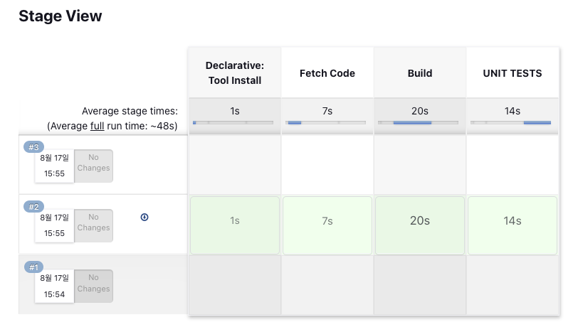 빌드를 실행하면 아래와 같이 파이프라인 스테이지가 표시된다.