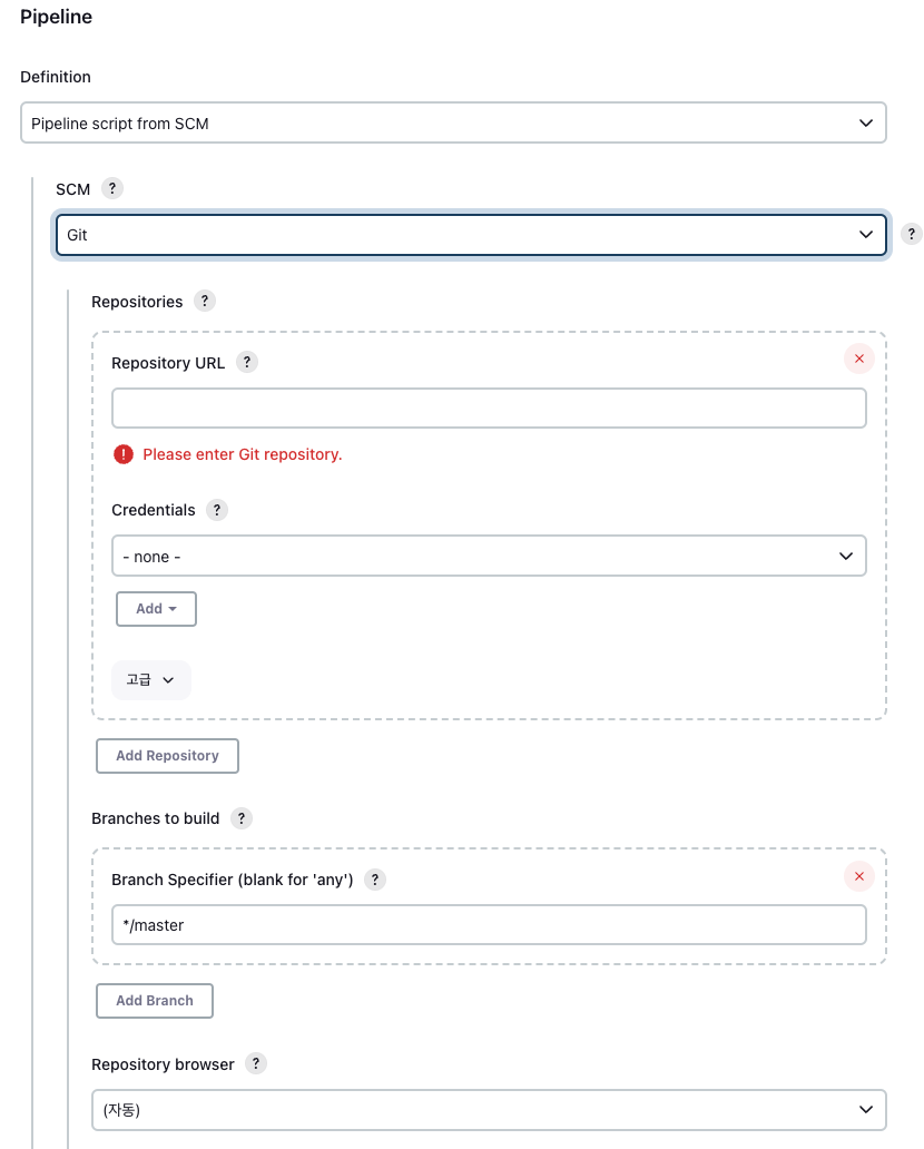 Pipeline 탭에 pipeline 생성 스크립트를 입력 후 저장