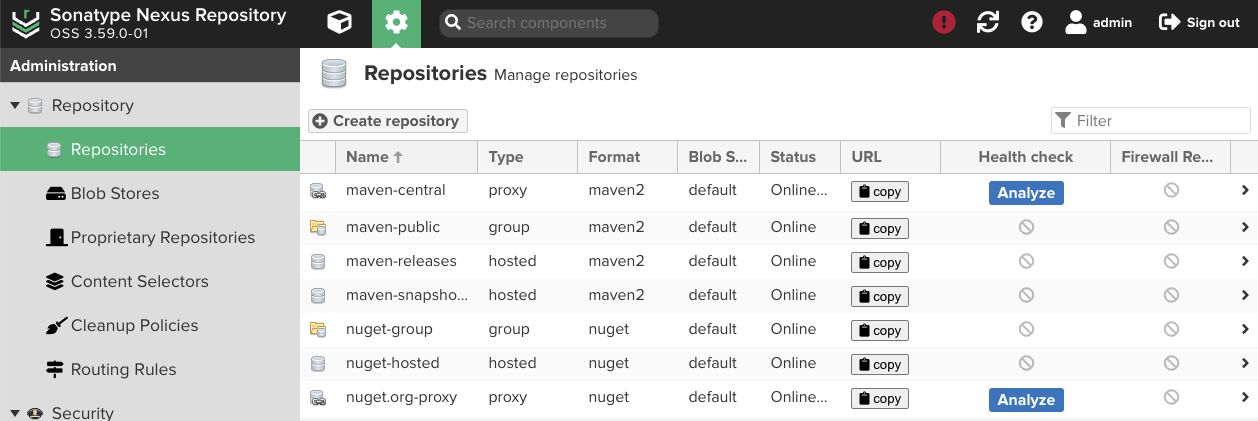 Nexus의 기본 레포지토리. 필요한 레포지토리를 추가할 수 있다.사용할 레포지토리를 선택 후 생성