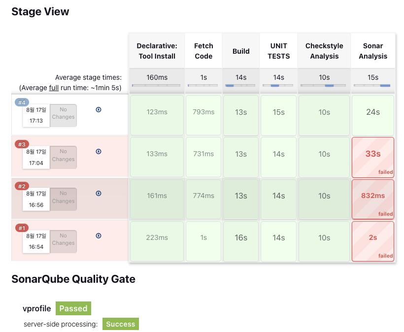 성공한 파이프라인 아래 실패 3개는 스크립트 오타와 SonarQube server URL 주소 오류로 실패