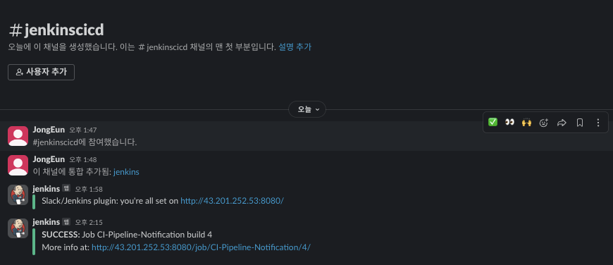 CI 파이프라인을 모두 구성했지만 Jenkins에서 빌드의 성공 혹은 실패를 확인하기 위해서는 Jenkins 대시보드를 확인해야하는 불편함이 아직 남아있다. 이를 Slack Notification을 활용해서 빌드 후 알림이 발생하도록 구성한다.