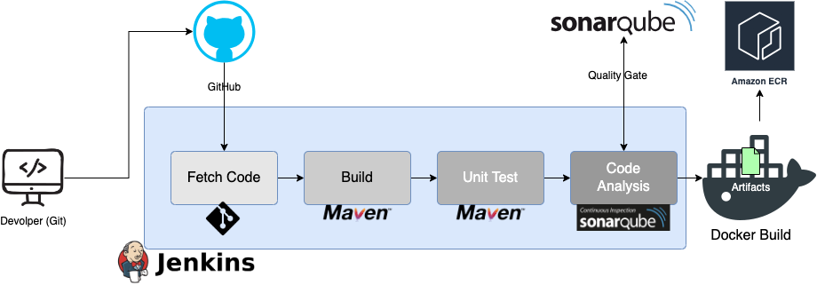 지금까지 만든 Pipeline에서 코드분석까지는 동일하지만 Nexus 레포지토리에 업로드하는 대신 빌드 결과물을 docker image로 빌드하고 이를 Amazon ECR로 업로드하는 것으로 대체한다.
