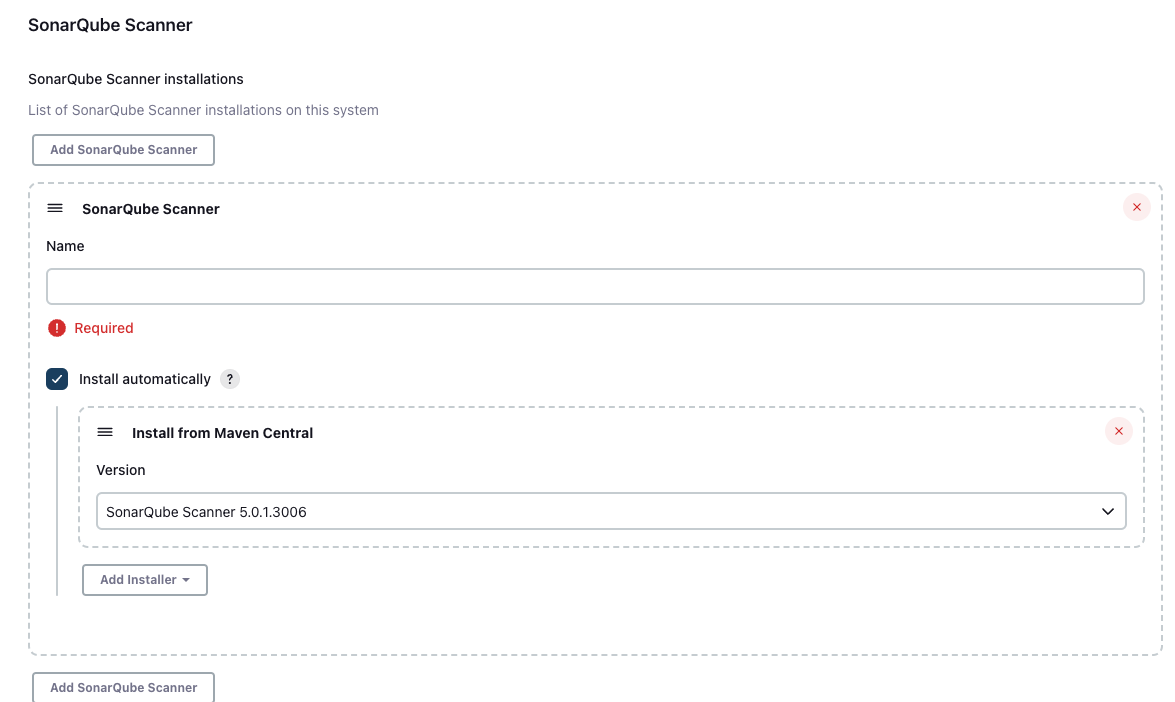 Jenkins 관리의 “Tools”에서 SonarQube Scanner를 추가