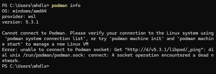 powershell 을 이용하였고 podman info 명령어를 통해 설치 확인을 가능합니다.