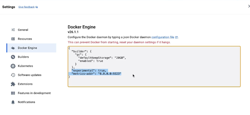 docker desktop -> settings -> docker engine -> configuration file 수정(metrics-addr) -> docker desktop 재실행