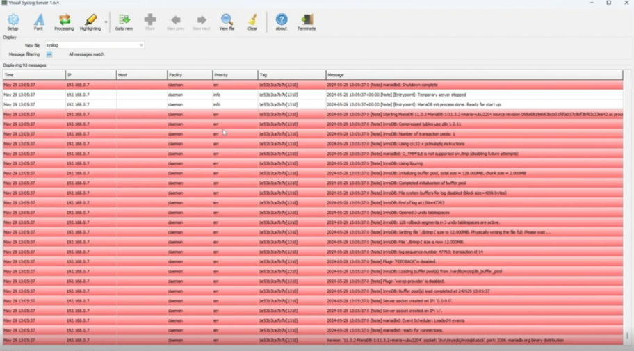 Windows 의 환경에서 해당 컨테이너를 실행하게 되며 Syslog Server Tools 에 실시간으로 로그가 찍히는 것을 gui 로 확인 가능합니다.