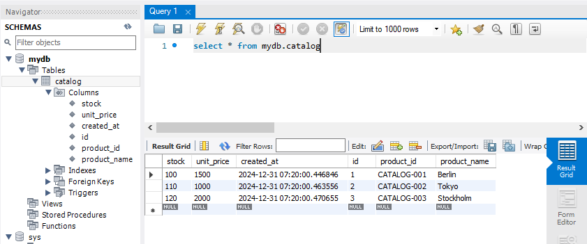 workbench 에서 mydb 데이터 베이스의 catalog 테이블이 생성된것을 볼 수 있다.