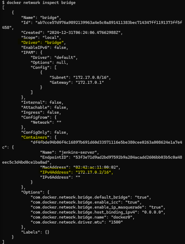 아래의 그림은 terminal 에서 birdge 네트워크의 정보이며 해당 실행중인 컨테이너도 확인 가능하다.