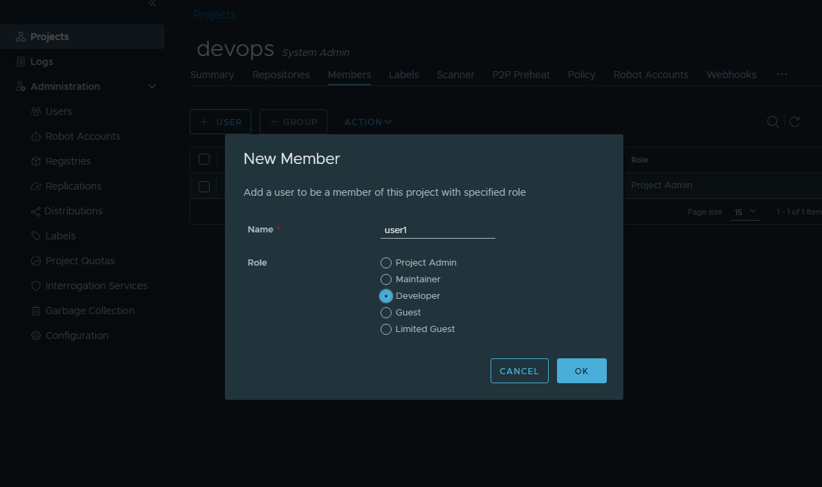 권한이 부여 받았기 때문에 user1 도 해당 이미지를 private harbor 로 부터 받을 수 있습니다.
