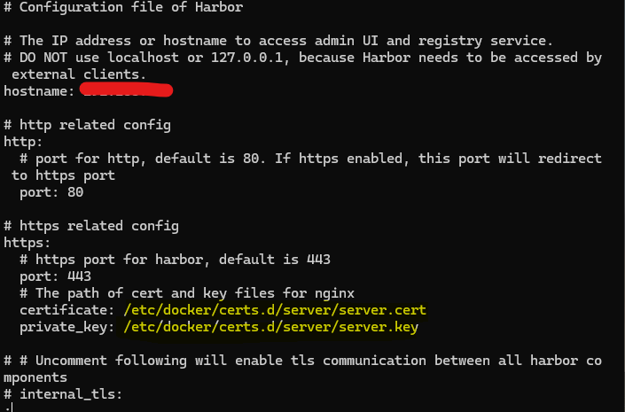 harbor.yml 파일에 hostname 에 hostpc ip address 와 certificate, private_key 에 위치를 확인해주어 변경해주시면 됩니다.