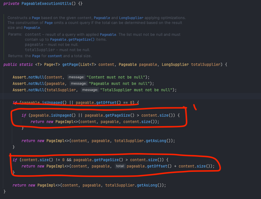 실제 Spring 내부 구현 코드를 해석해보면, 첫번째 페이지면서 content의 크기가 한 페이지의 사이즈보다 작을 때와 마지막 페이지일 때는 totalSupplier 대신 content의 size와 offset 값을 사용하는 것을 볼 수 있다.