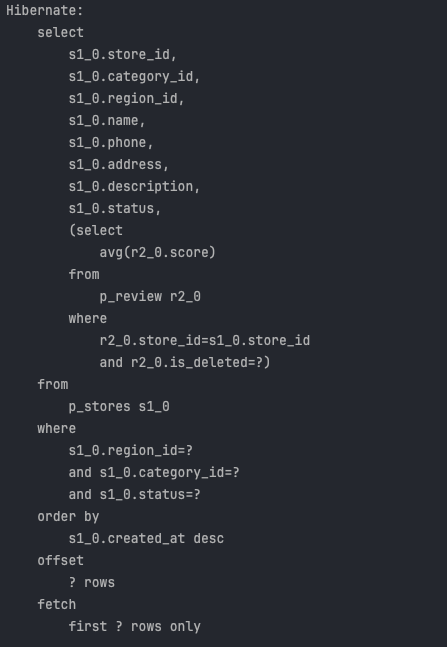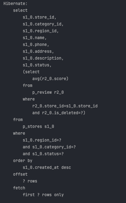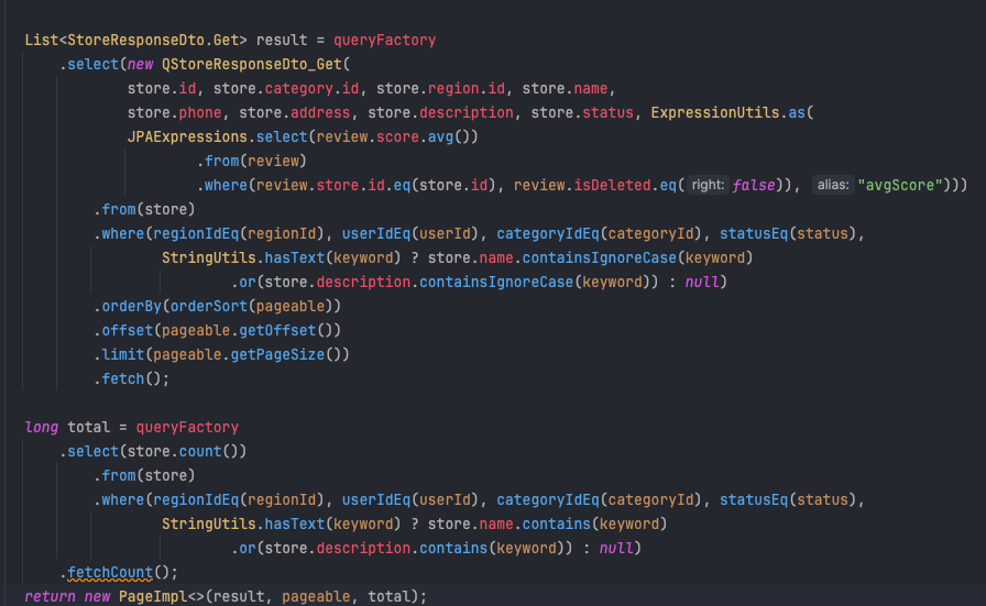 .leftJoin(review).on(review.store.id.eq(store.id).and(review.isDeleted.eq(false))) // JOIN으로 별점 가져오기