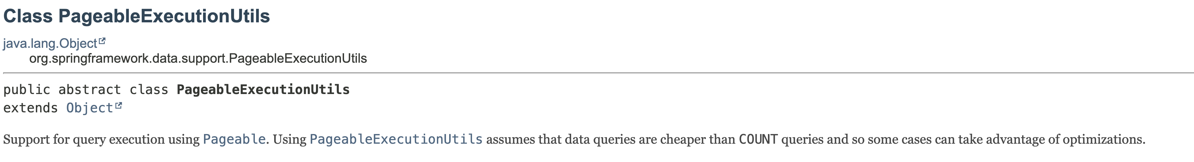 아래의 자바의 공식 문서를 따르면 PageableExecutionUtils을 사용하면 단순 new PageImpl()을 사용했을 때 보다 성능 최적화 이점이 있다는 것을 볼 수 있다.